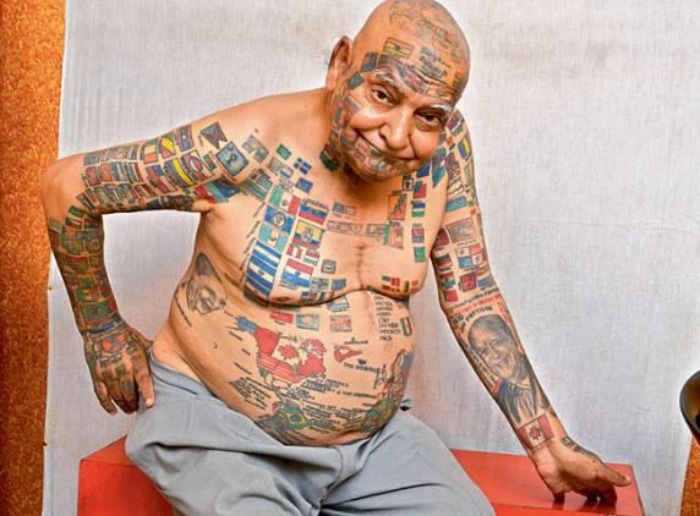 Pulling out all his teeth, tattooing flags of every major country of the world on his body (over 366 of them), downing a huge bottle of ketchup in less than four minutes etc, might not be such a big deal for Har Parkash Rishi, who is now getting images of global leaders tattooed on his body to add to images of Indian Prime Minister Narendra Modi, US President Barack Obama, Britain's Queen Elizabeth and Mahatma Gandhi, the leader of India's independence movement.Born in 1942 in New Delhi, Rishi who first got into the Guinness Book of World Records in 1990 when he rode a scooter for 1,001 hours with two friends, has since been relentless.While it is the tattoos on his body, (more than 500 in all), that brought him fame, Rishi, an auto parts manufacturer by profession, says the toughest one was stuffing the straws in his mouth.